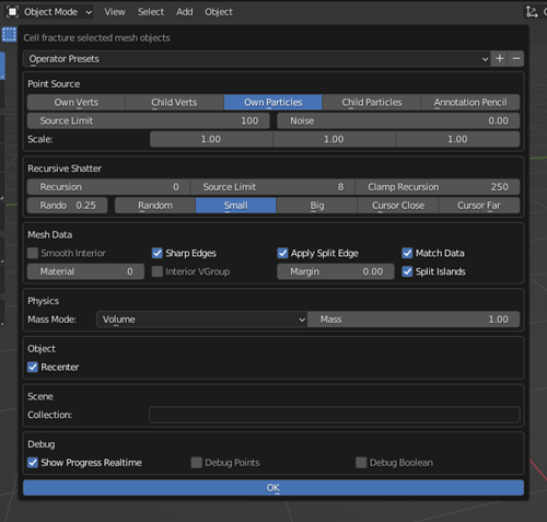 In object mode, select your model and follow the path: Object/QuickEffects/CellFracture. The next window will pop up